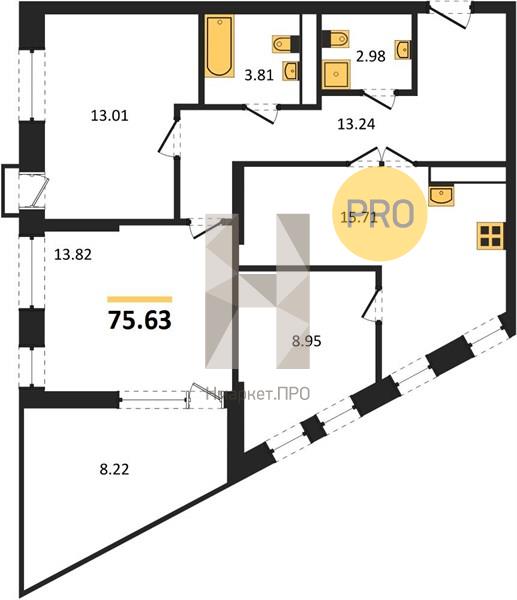 Квартира: 3 к 75,63 кв.м., 4 этаж в комплексе Z-town, 1 очередь, корп.1, сдача: 2кв. , этажей: 21, адрес Воронеж г., Чуева наб., д. 7, Застройщик: Новый код.