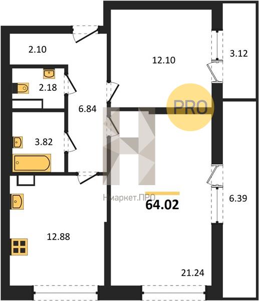 Квартира: 2 к 64,02 кв.м., 4 этаж в комплексе Бунин, 3 очередь, корп.1 (Секции 6,7), сдача: 2кв. , этажей: 23, адрес Воронеж г., Московский пр., д. 136, Застройщик: ВДК.