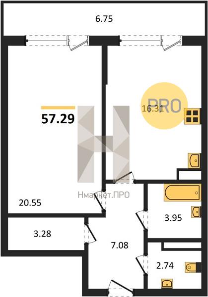 Квартира: 1 к 57,29 кв.м., 8 этаж в комплексе Бунин, 3 очередь, корп.1 (Секции 6,7), сдача: 2кв. , этажей: 23, адрес Воронеж г., Московский пр., д. 136, Застройщик: ВДК.