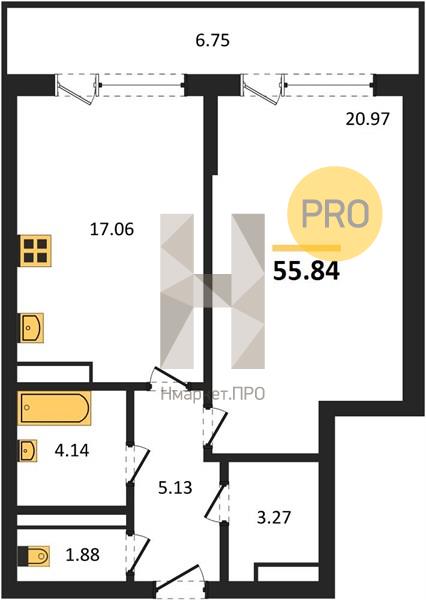 Квартира: 1 к 55,84 кв.м., 16 этаж в комплексе Бунин, 3 очередь, корп.1 (Секции 6,7), сдача: 2кв. , этажей: 23, адрес Воронеж г., Московский пр., д. 136, Застройщик: ВДК.
