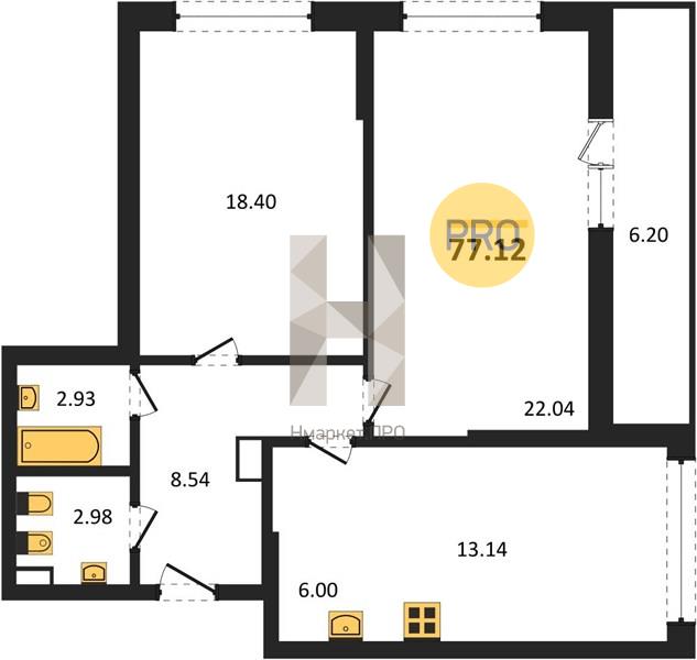 Квартира: 2 к 77,12 кв.м., 2 этаж в комплексе Бунин, 3 очередь, корп.1 (Секции 6,7), сдача: 2кв. , этажей: 23, адрес Воронеж г., Московский пр., д. 136, Застройщик: ВДК.